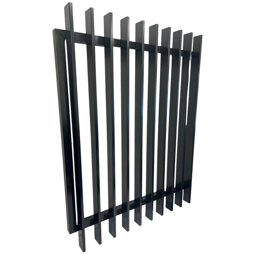 Satin black aluminum pool-safe vertical blade fence gate panel (radiator panel) with powder coating, includes top caps. Fully welded and ready for installation. Buy Safe Tech Hinges and a Top Pull Latch for fitting. The gate, hinges, and latch have a gap of 1005 mm on the gate panel. Australian standards AS1926 compliant. This product is independently tested and certified by a NATA accredited Lab in Australia. The complete report is available upon request with your purchase.