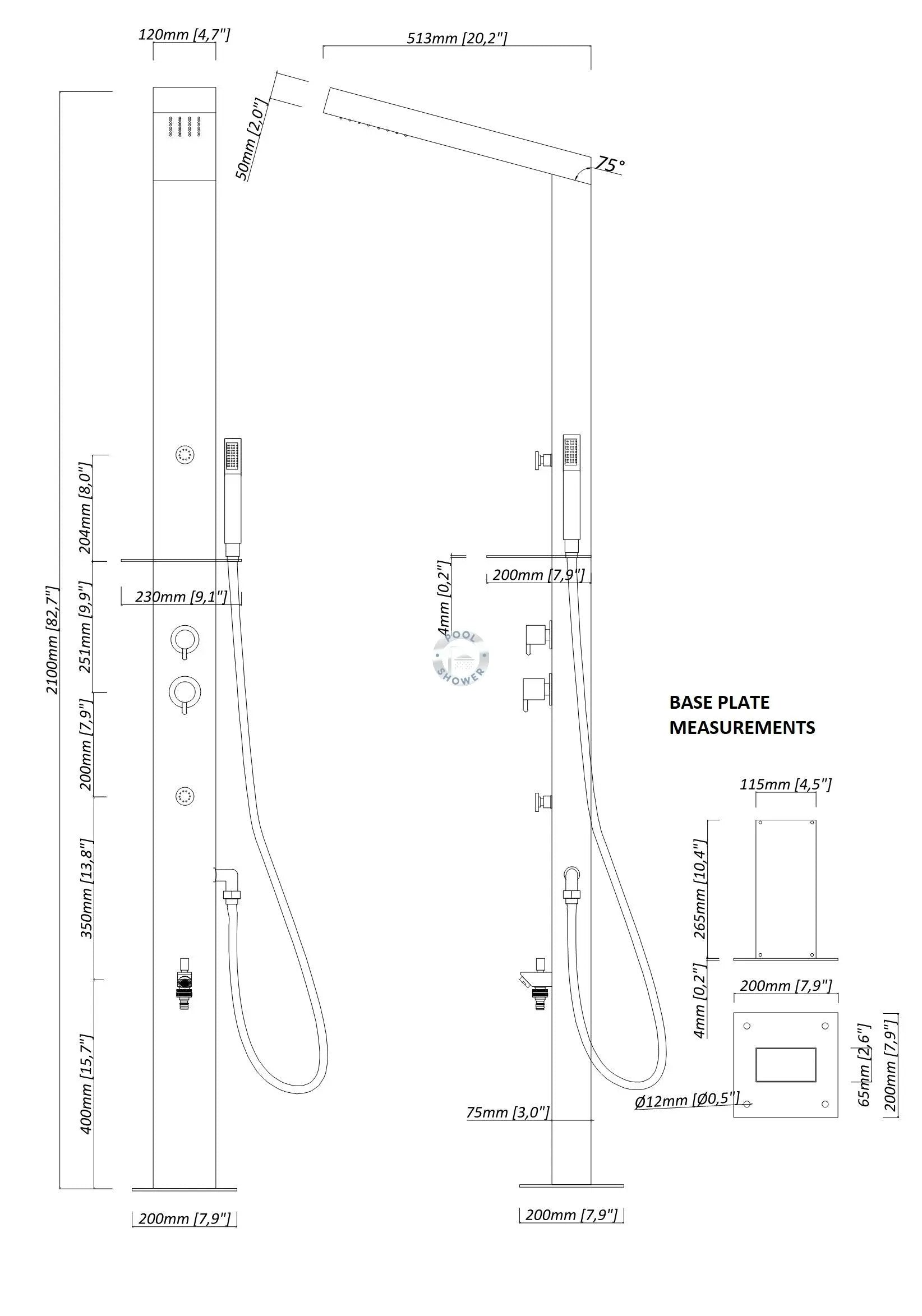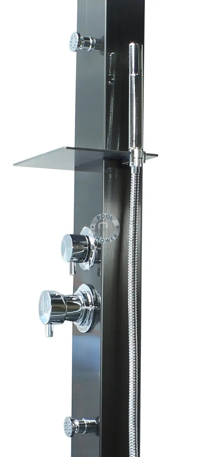 - Non-Corrosive Ion-Plated Black Marine Grade Brushed 316 Stainless Steel The colour will not rub off, come off or fade, it is part of the stainless steel. Please Note: The colour of the Stainless Steel Panel is BLACK. However, the handles, the handheld shower, the foot spout, and the base plate are a SILVER colour.