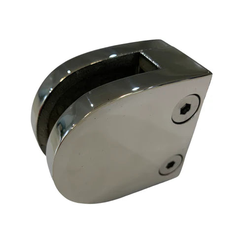 Glass clamp in a round D shape with a flat back suitable for 8, 10, and 12mm glass, comes with rubber gaskets included.