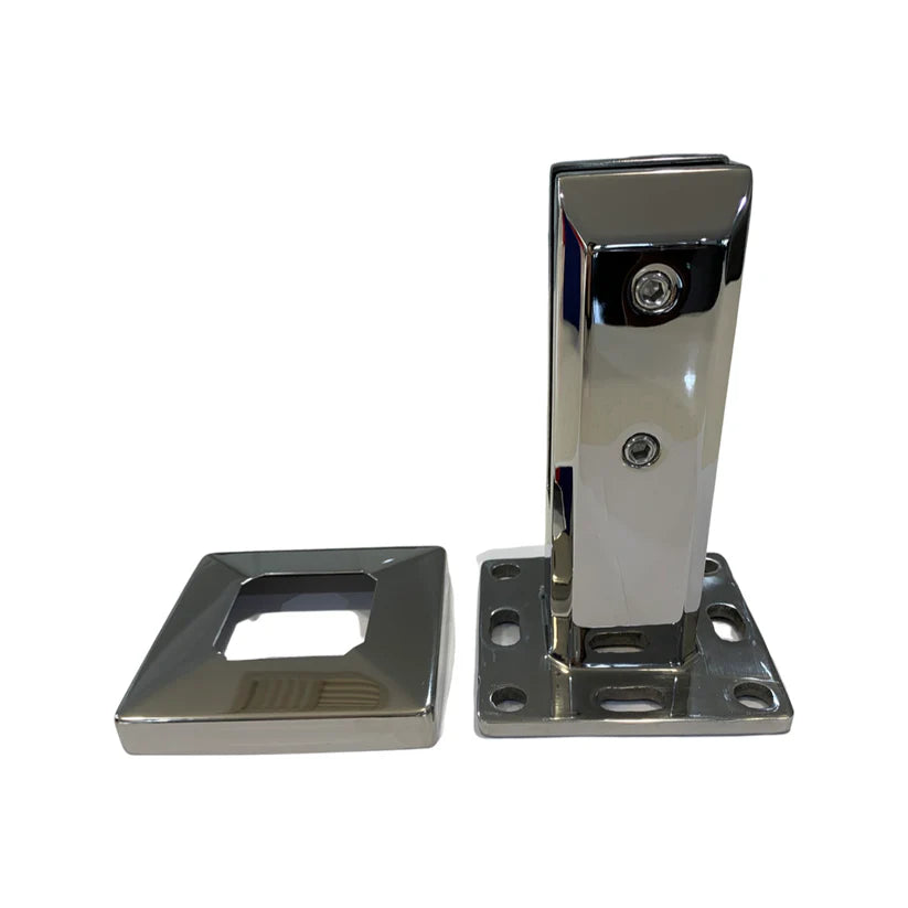 Base mount spigot and raised cover plate made from premium G2205 duplex stainless steel designed for frameless glass pool fencing and balustrading, featuring a patterned glass adjustment for a simple DIY installation.