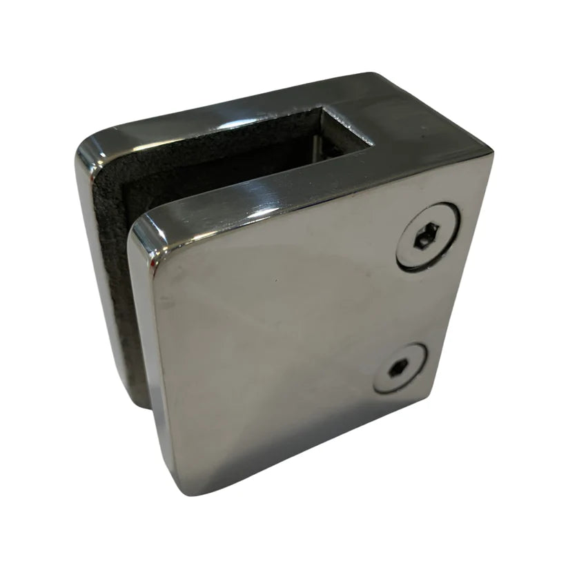 Glass clamp with a rounded back designed for a 50.8mm diameter post. Compatible with 8, 10, 12mm glass, includes rubber gaskets. Crafted from G316 stainless steel.